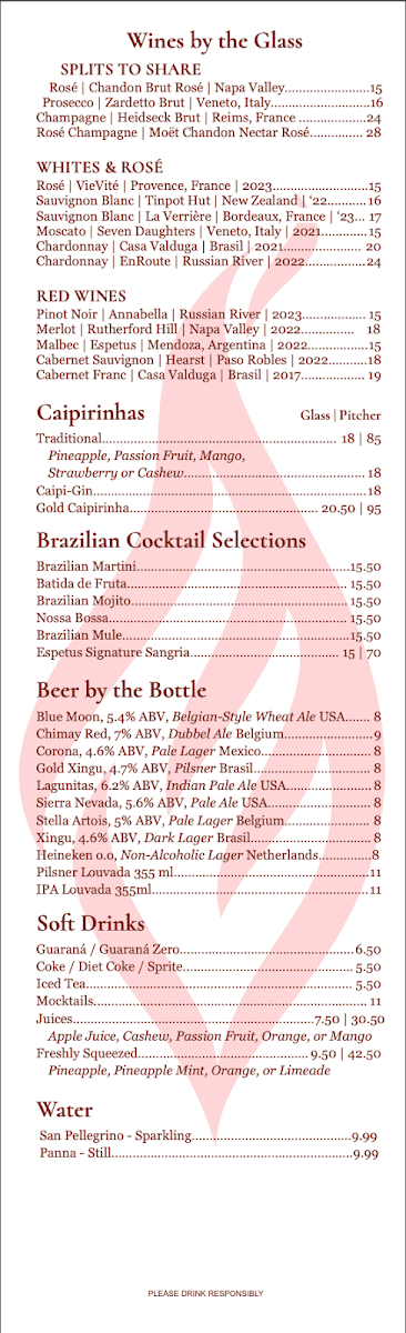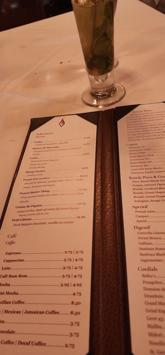 To round off your meal, don't miss out on the delightful DESSERT MENU. Treat yourself to the rich and creamy Pudim or the tart and refreshing Mousse de Maracujá, a favorite among locals and a true taste of Brazil. For something lighter, opt for two scoops of their refreshing Mango Sorbet – a perfect choice to cleanse the palate! And if you have a penchant for gelato, the delicious selection is sure to tempt you.